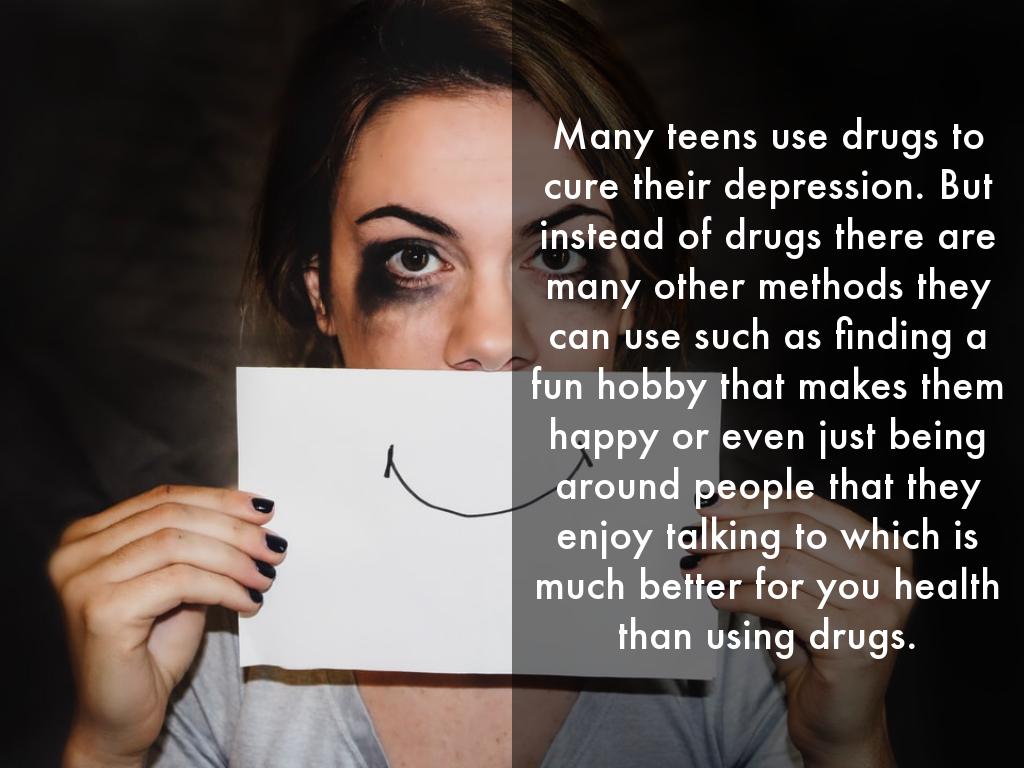 Many teens use drugs to cure their depression. But instead of drugs there are many other methods they can use such as finding a fun hobby that makes them happy or even just being around people that they enjoy talking to which is much better for you health than using drugs.