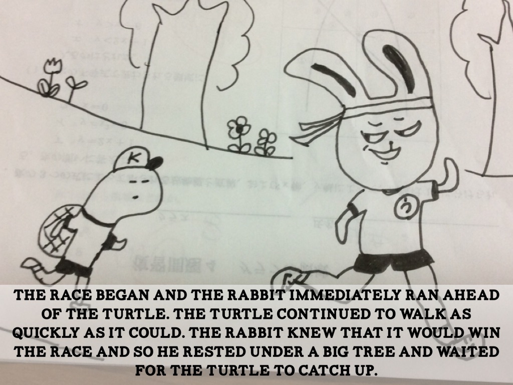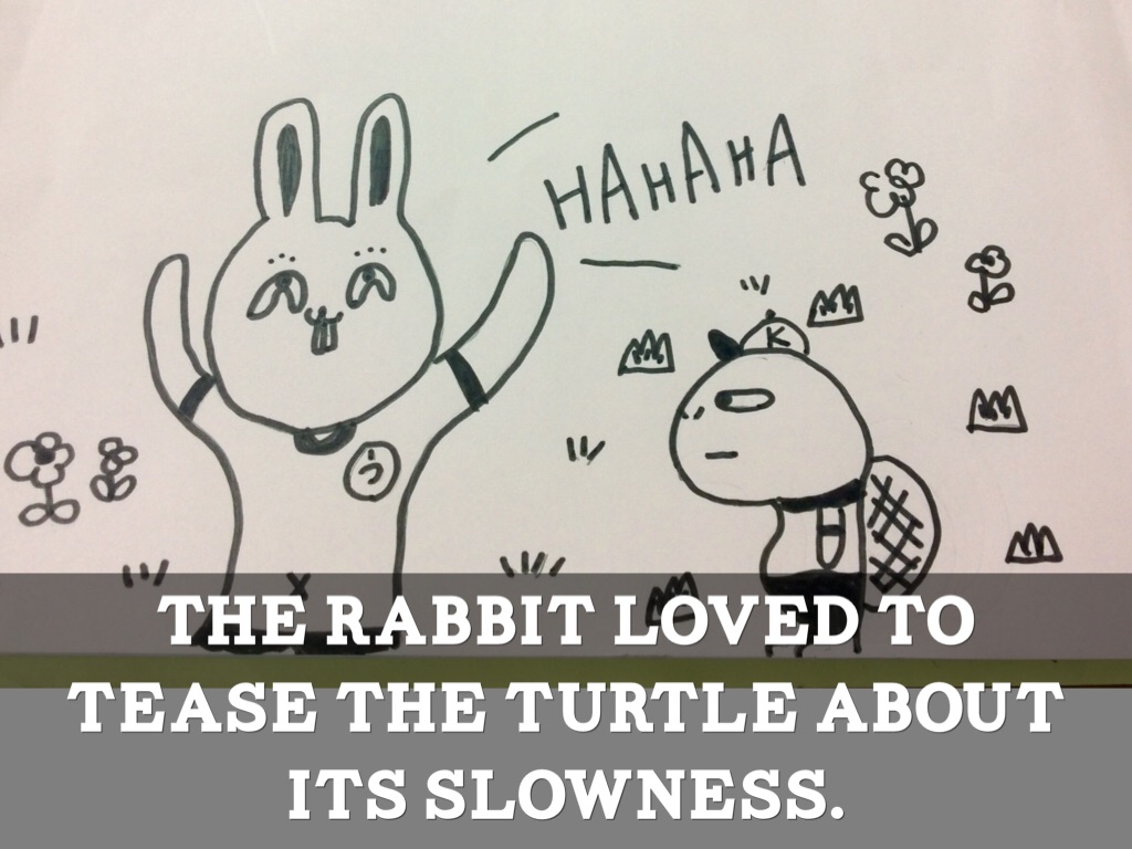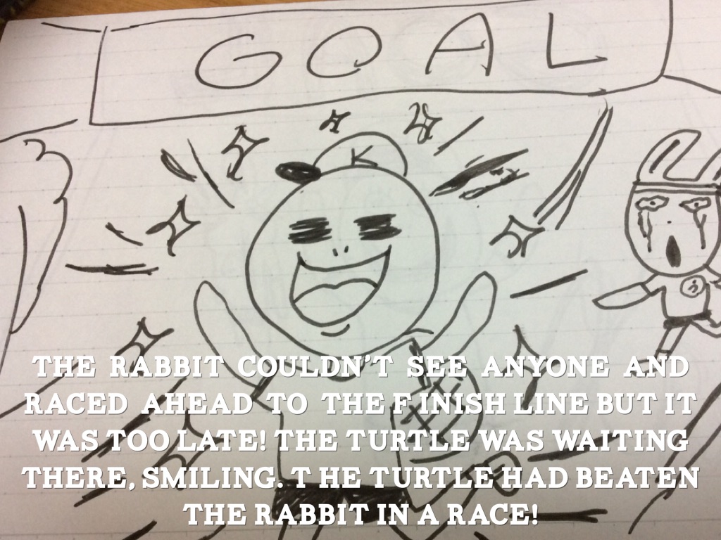 The rabbit couldn’t see anyone and raced ahead to the f inish line but it was too late! The turtle was waiting there, smiling. T he turtle had beaten the rabbit in a race!