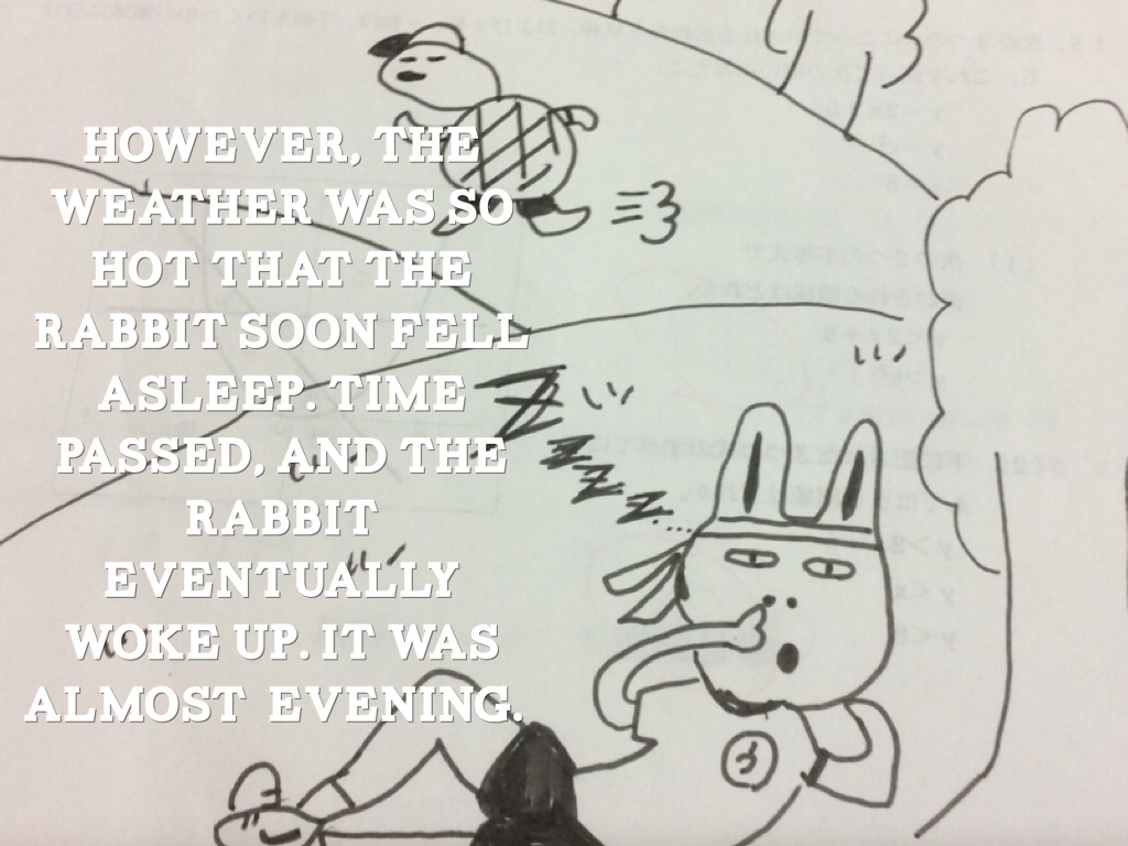However, the weather was so hot that the rabbit soon fell asleep. Time passed, and the rabbit eventually woke up. It was almost evening.