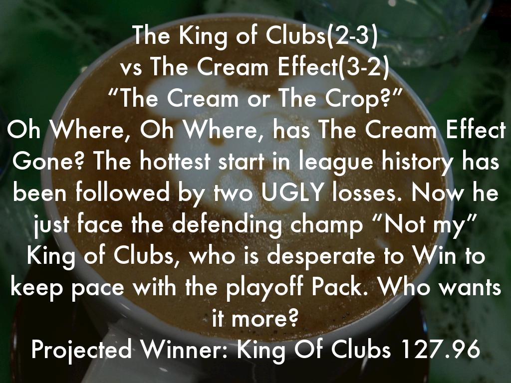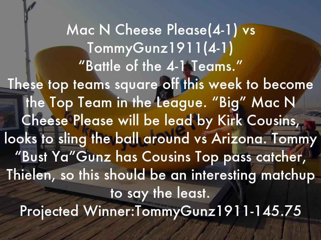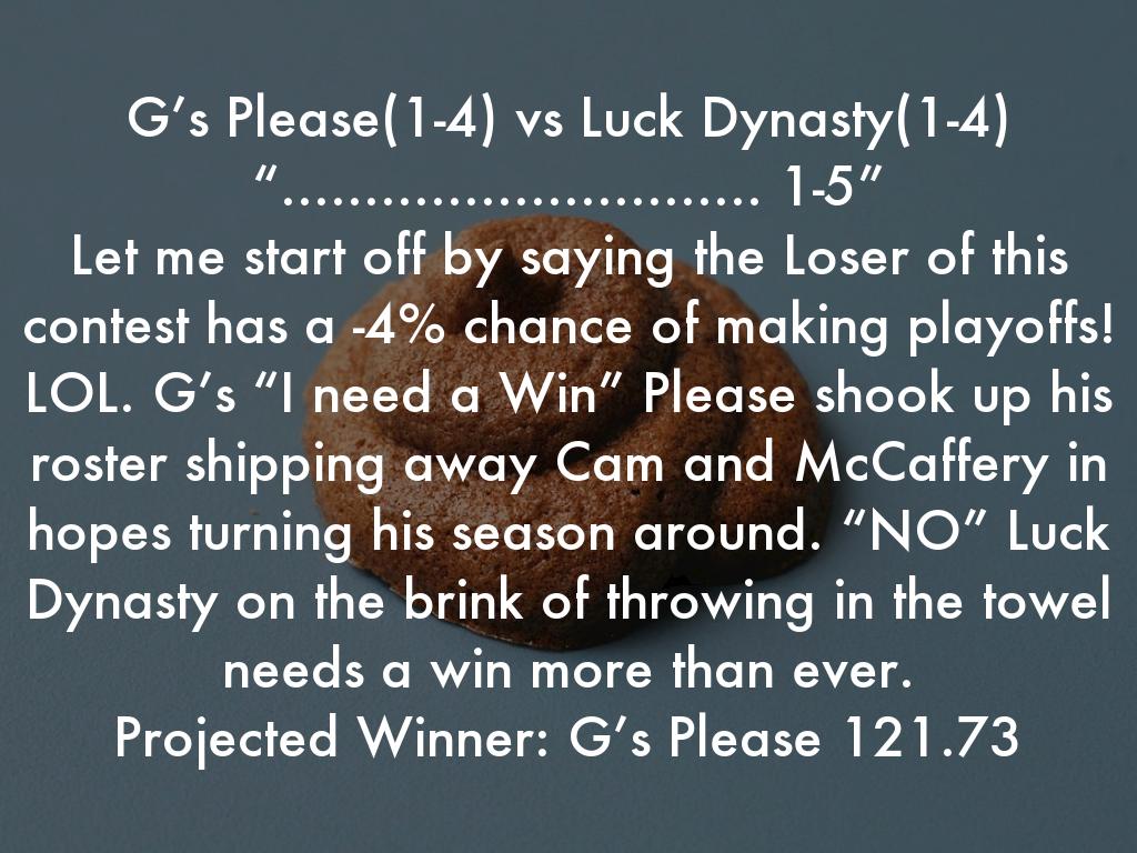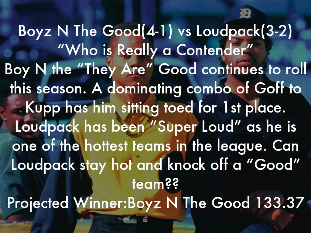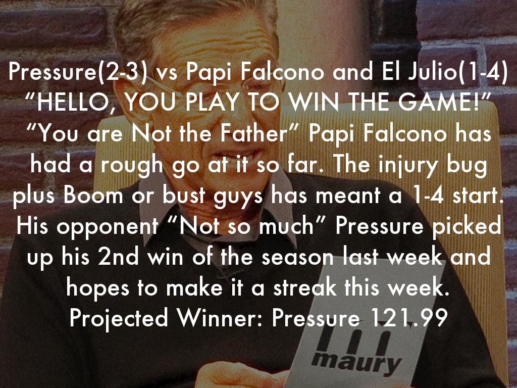 “You are Not the Father” Papi Falcono has had a rough go at it so far. The injury bug plus Boom or bust guys has meant a 1-4 start. His opponent “Not so much” Pressure picked up his 2nd win of the season last week and hopes to make it a streak this week.