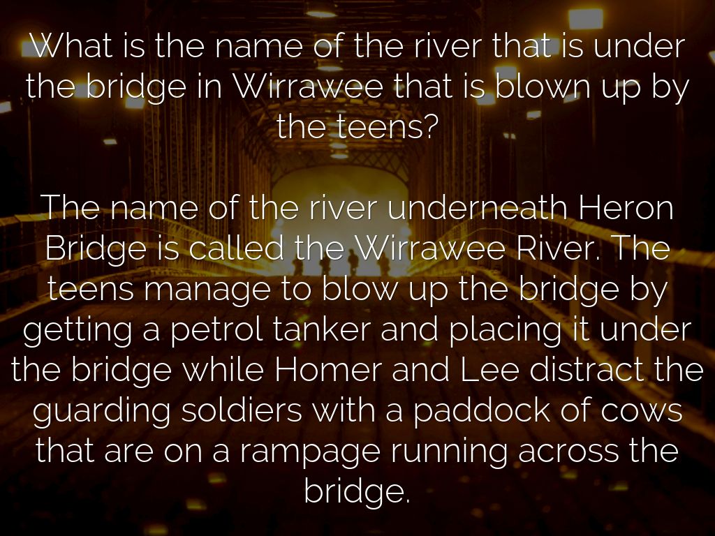The name of the river underneath Heron Bridge is called the Wirrawee River. The teens manage to blow up the bridge by getting a petrol tanker and placing it under the bridge while Homer and Lee distract the guarding soldiers with a paddock of cows that are on a rampage running across the bridge.
