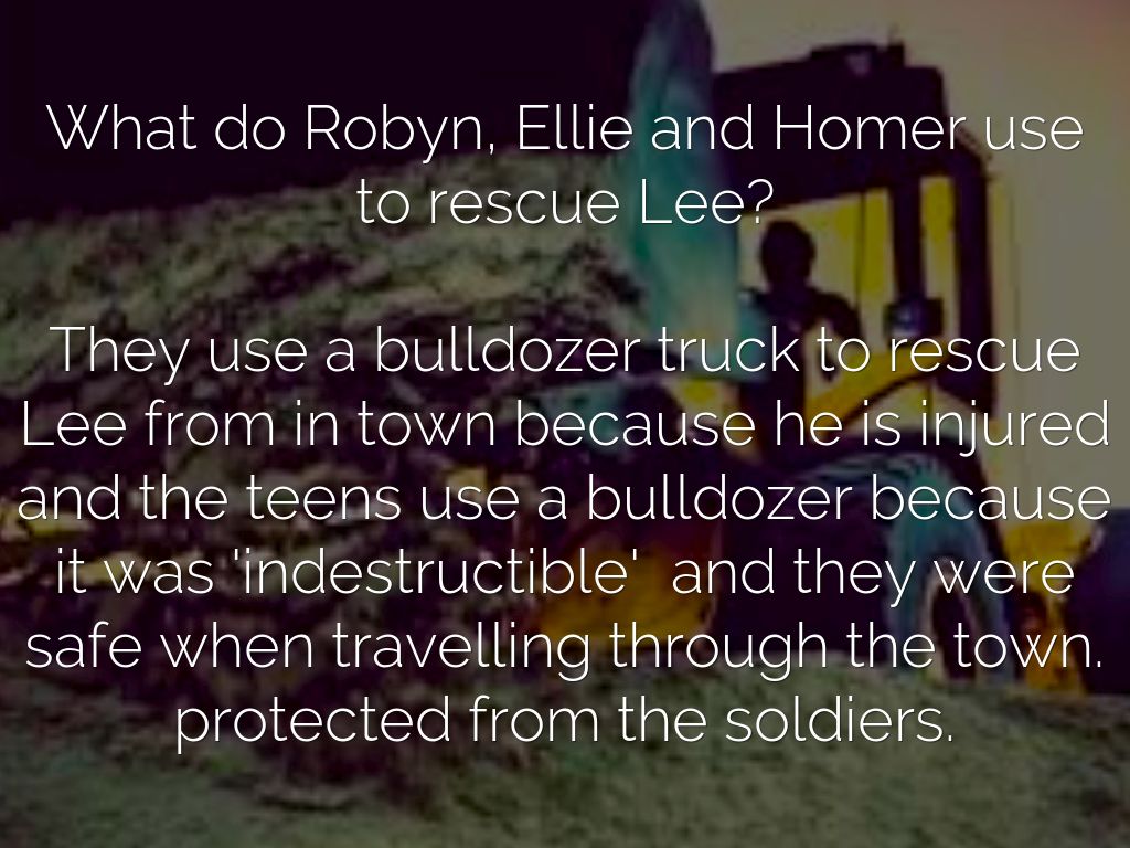 They use a bulldozer truck to rescue Lee from in town because he is injured and the teens use a bulldozer because it was 'indestructible' and they were safe when travelling through the town.