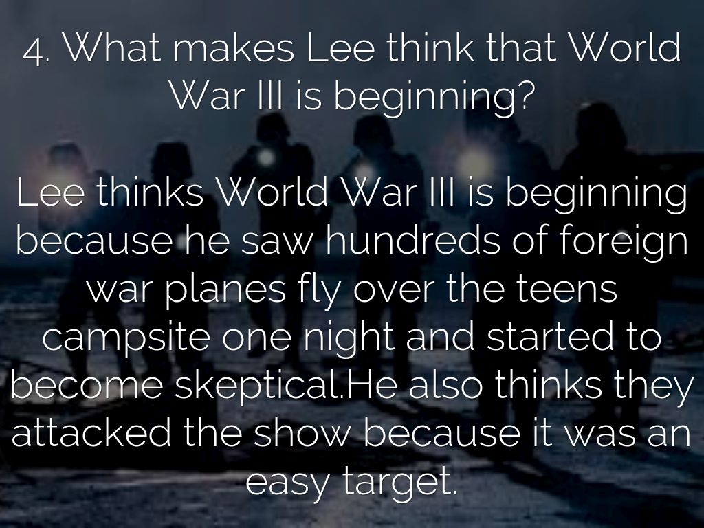Lee thinks World War III is beginning because he saw hundreds of foreign war planes fly over the teens campsite one night and started to become skeptical.He also thinks they attacked the show because it was an easy target.