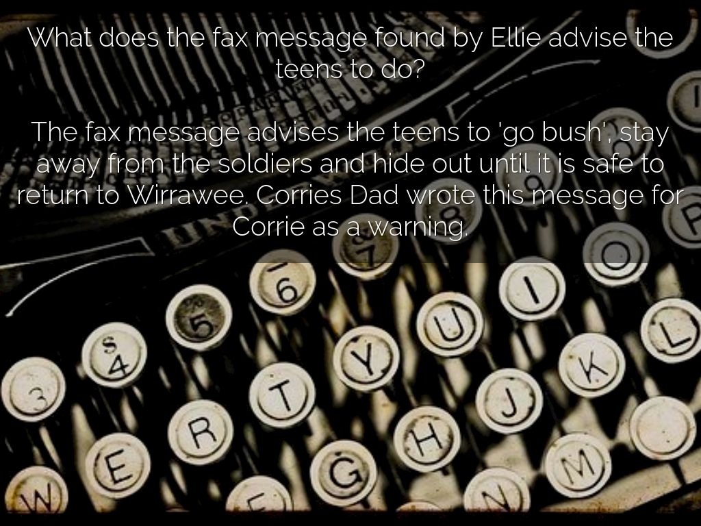 The fax message advises the teens to 'go bush', stay away from the soldiers and hide out until it is safe to return to Wirrawee. Corries Dad wrote this message for Corrie as a warning.