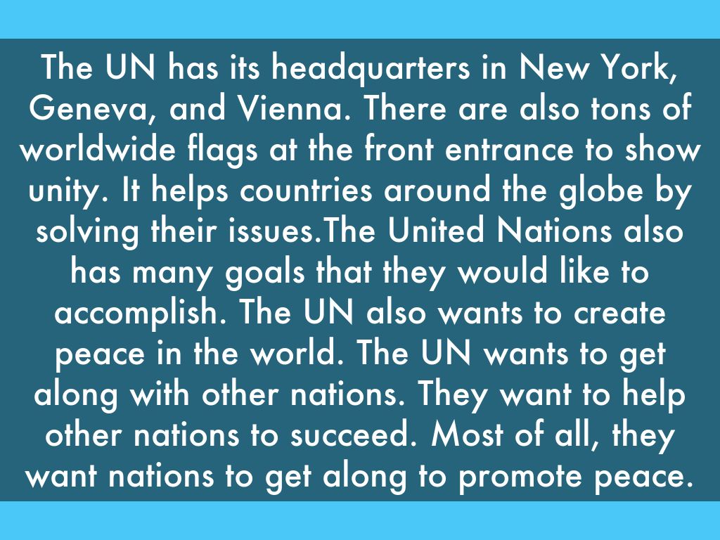The UN has its headquarters in New York, Geneva, and Vienna. There are also tons of worldwide flags at the front entrance to show unity. It helps countries around the globe by solving their issues.The United Nations also has many goals that they would like to accomplish. The UN also wants to create peace in the world. The UN wants to get along with other nations. They want to help other nations to succeed. Most of all, they want nations to get along to promote peace.