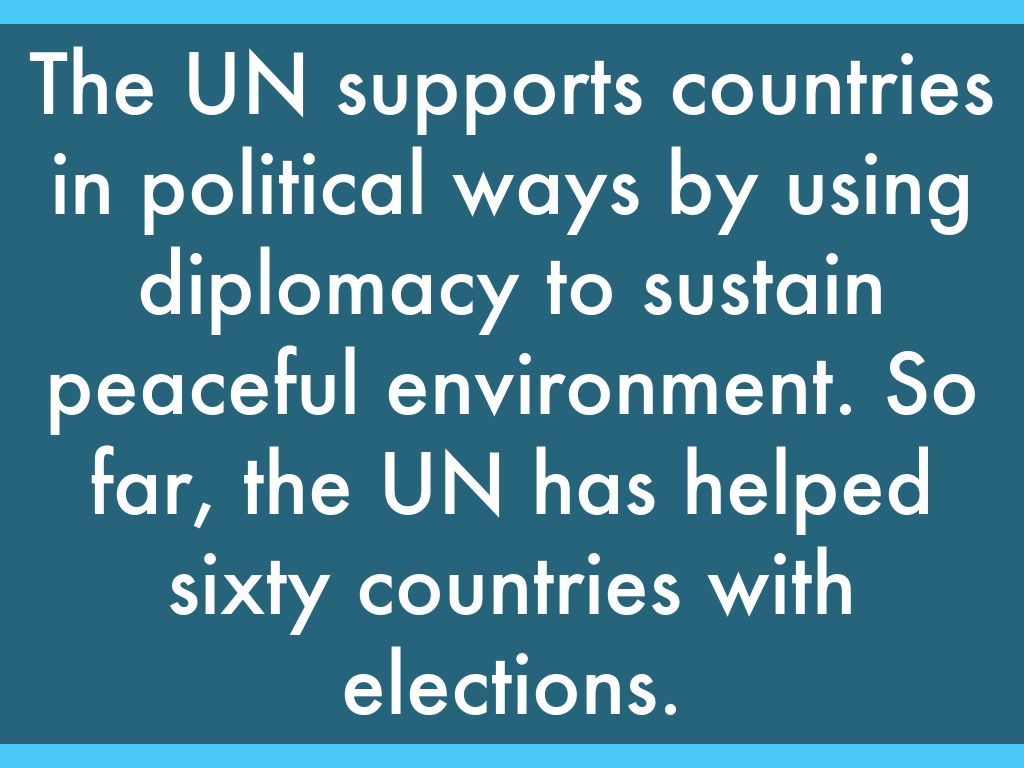 The UN supports countries in political ways by using diplomacy to sustain peaceful environment. So far, the UN has helped sixty countries with elections.