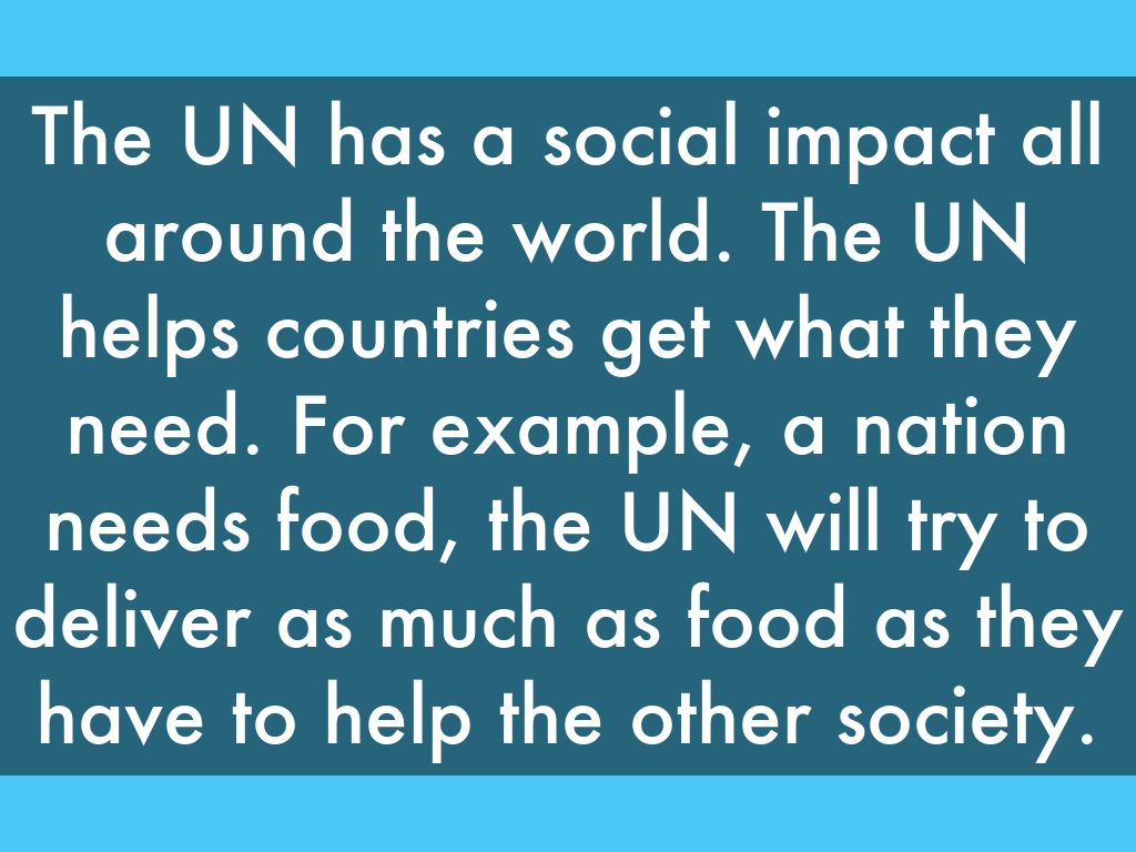 The UN has a social impact all around the world. The UN helps countries get what they need. For example, a nation needs food, the UN will try to deliver as much as food as they have to help the other society.