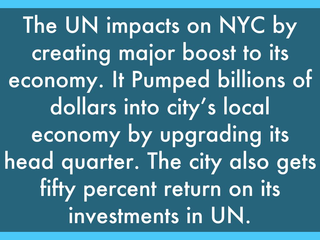 The UN impacts on NYC by creating major boost to its economy. It Pumped billions of dollars into city’s local economy by upgrading its head quarter. The city also gets fifty percent return on its investments in UN.