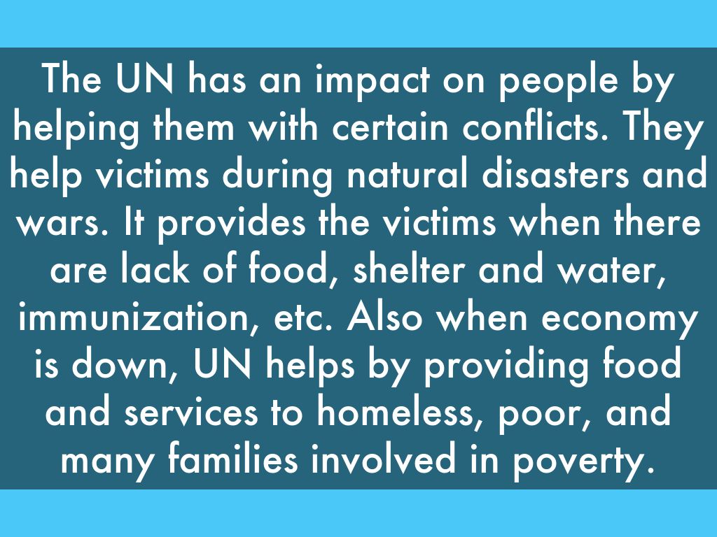 The UN has an impact on people by helping them with certain conflicts. They help victims during natural disasters and wars. It provides the victims when there are lack of food, shelter and water, immunization, etc. Also when economy is down, UN helps by providing food and services to homeless, poor, and many families involved in poverty.