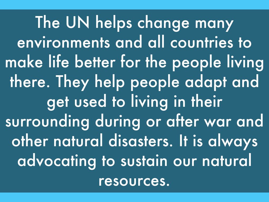 The UN helps change many environments and all countries to make life better for the people living there. They help people adapt and get used to living in their surrounding during or after war and other natural disasters. It is always advocating to sustain our natural resources.