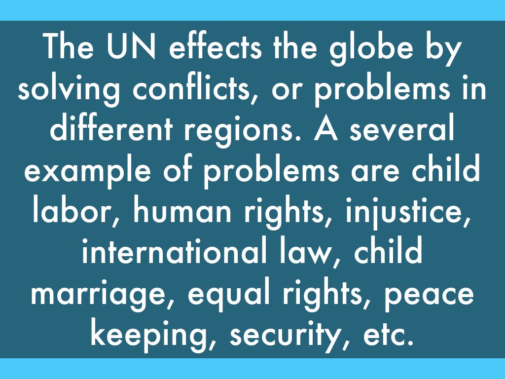 The UN effects the globe by solving conflicts, or problems in different regions. A several example of problems are child labor, human rights, injustice, international law, child marriage, equal rights, peace keeping, security, etc.