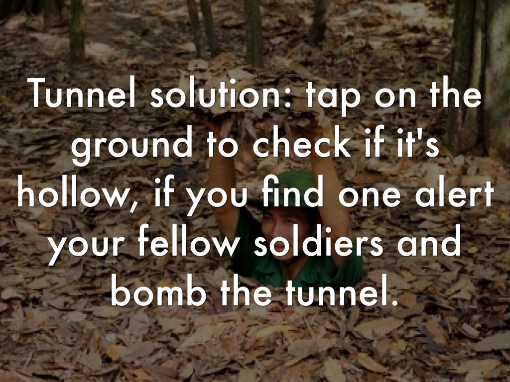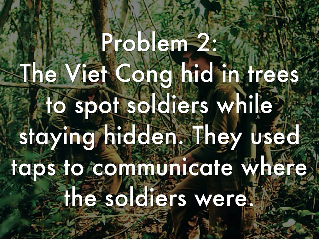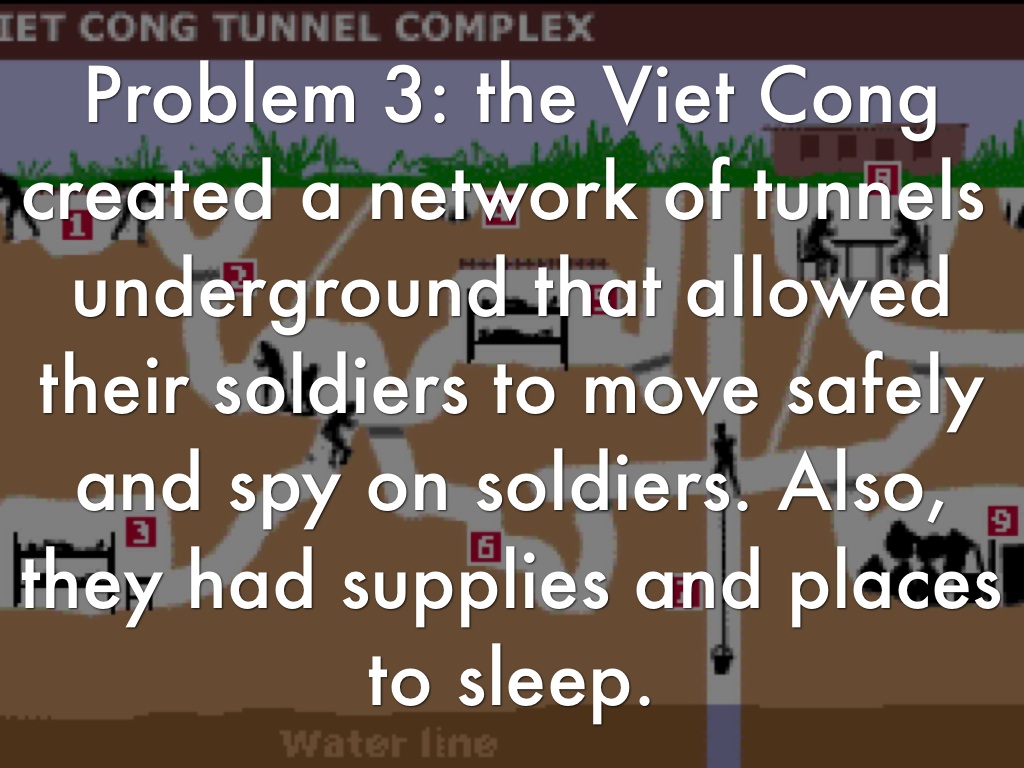 Problem 3: the Viet Cong created a network of tunnels underground that allowed their soldiers to move safely and spy on soldiers. Also, they had supplies and places to sleep.