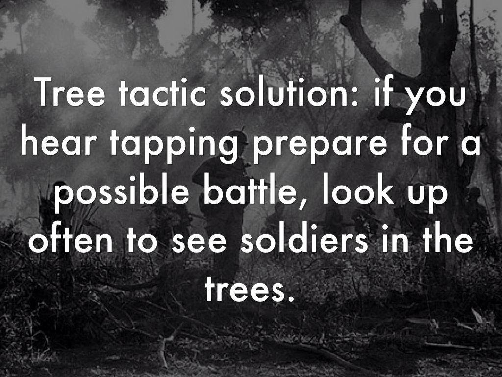 Tree tactic solution: if you hear tapping prepare for a possible battle, look up often to see soldiers in the trees.