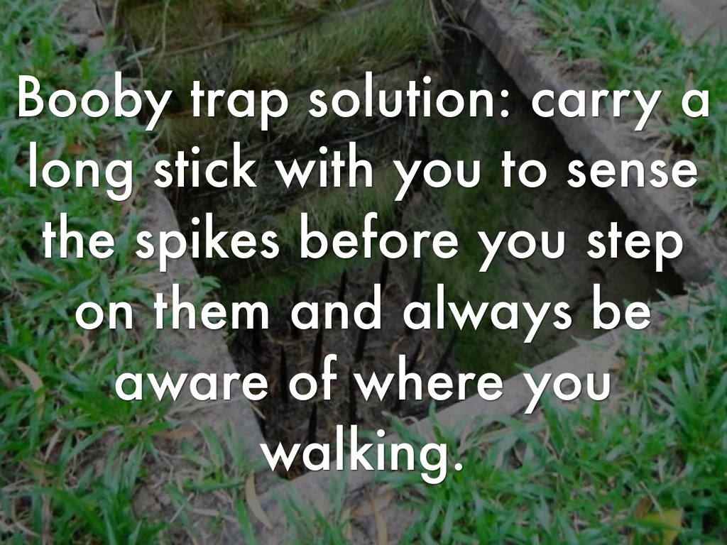 Booby trap solution: carry a long stick with you to sense the spikes before you step on them and always be aware of where you walking.