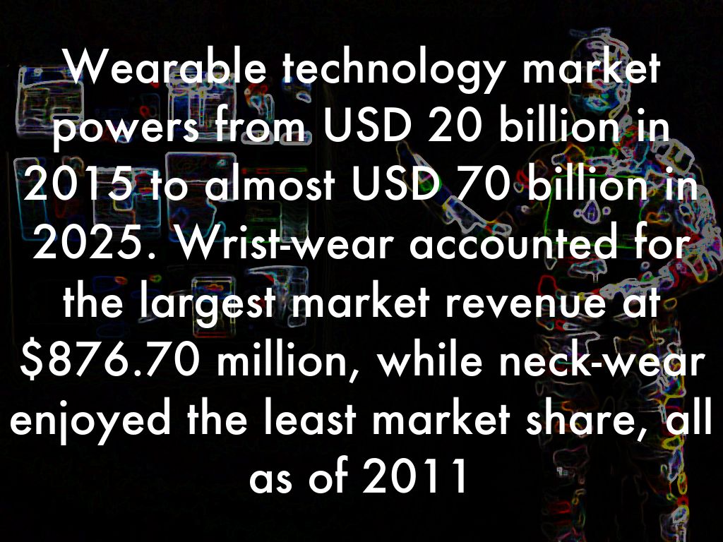 Wearable technology market powers from USD 20 billion in 2015 to almost USD 70 billion in 2025. Wrist-wear accounted for the largest market revenue at $876.70 million, while neck-wear enjoyed the least market share, all as of 2011