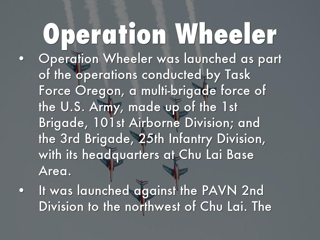 Operation Wheeler was launched as part of the operations conducted by Task Force Oregon, a multi-brigade force of the U.S. Army, made up of the 1st Brigade, 101st Airborne Division; and the 3rd Brigade, 25th Infantry Division, with its headquarters at Chu Lai Base Area.