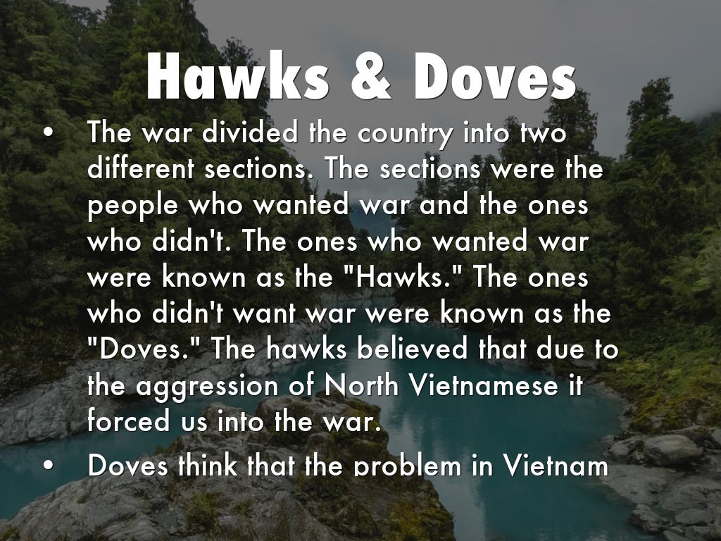 The war divided the country into two different sections. The sections were the people who wanted war and the ones who didn't. The ones who wanted war were known as the "Hawks." The ones who didn't want war were known as the "Doves." The hawks believed that due to the aggression of North Vietnamese it forced us into the war.