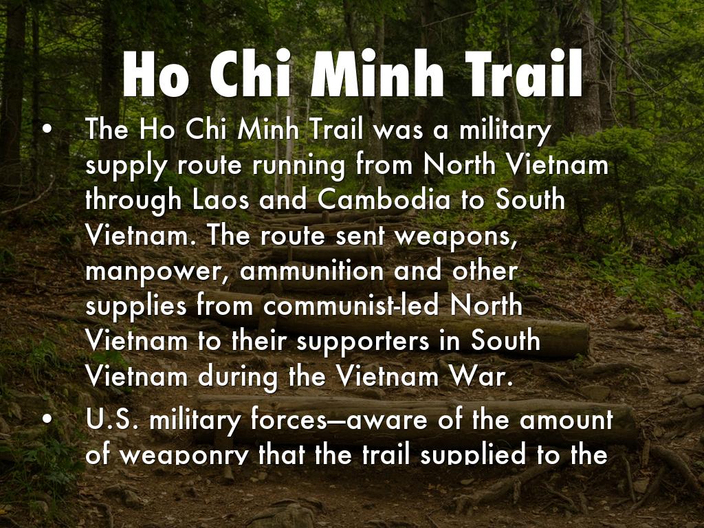 The Ho Chi Minh Trail was a military supply route running from North Vietnam through Laos and Cambodia to South Vietnam. The route sent weapons, manpower, ammunition and other supplies from communist-led North Vietnam to their supporters in South Vietnam during the Vietnam War.