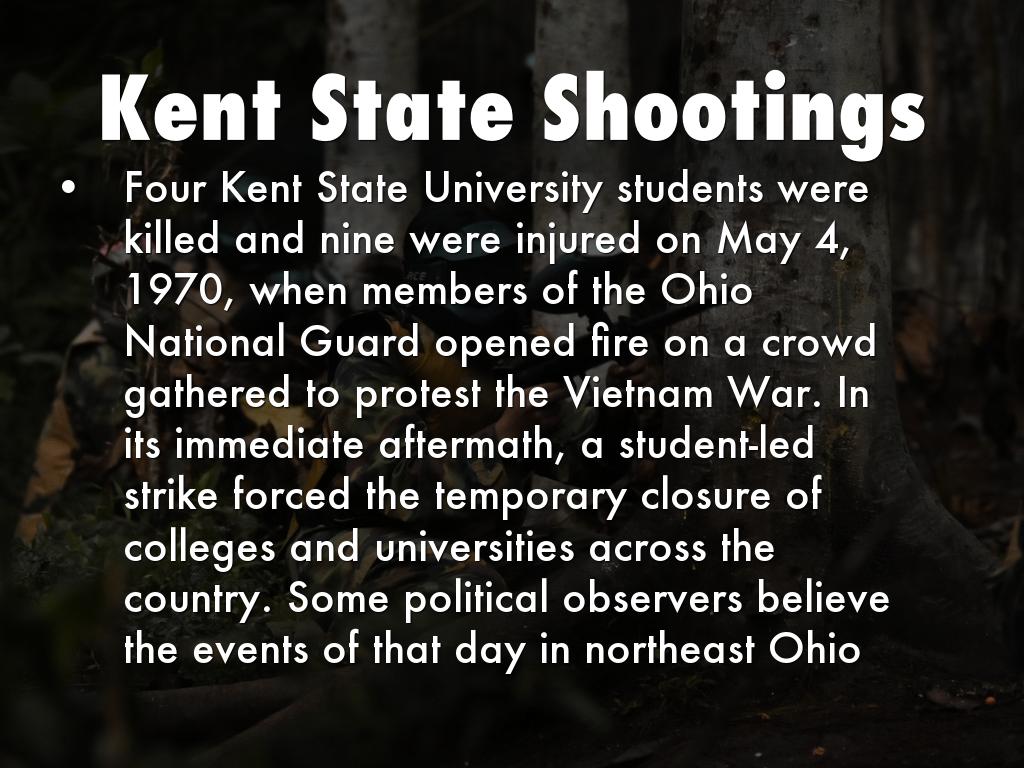 Four Kent State University students were killed and nine were injured on May 4, 1970, when members of the Ohio National Guard opened fire on a crowd gathered to protest the Vietnam War. In its immediate aftermath, a student-led strike forced the temporary closure of colleges and universities across the country. Some political observers believe the events of that day in northeast Ohio tilted public opinion against the war and may have contributed to the downfall of President Richard Nixon.