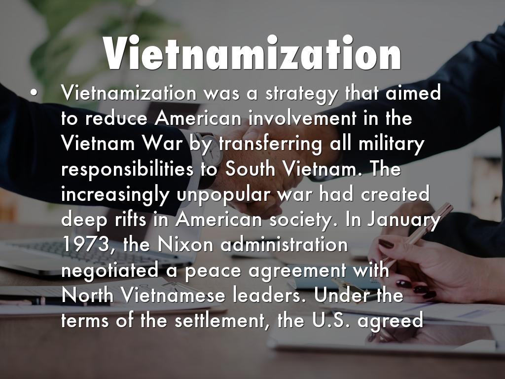 Vietnamization was a strategy that aimed to reduce American involvement in the Vietnam War by transferring all military responsibilities to South Vietnam. The increasingly unpopular war had created deep rifts in American society. In January 1973, the Nixon administration negotiated a peace agreement with North Vietnamese leaders. Under the terms of the settlement, the U.S. agreed to withdraw its remaining troops within 60 days in exchange for an immediate cease-fire, the return of American prisoners of war, and North Vietnam’s promise to recognize the legitimacy of South Vietnam’s government and submit future disputes to an international commission.