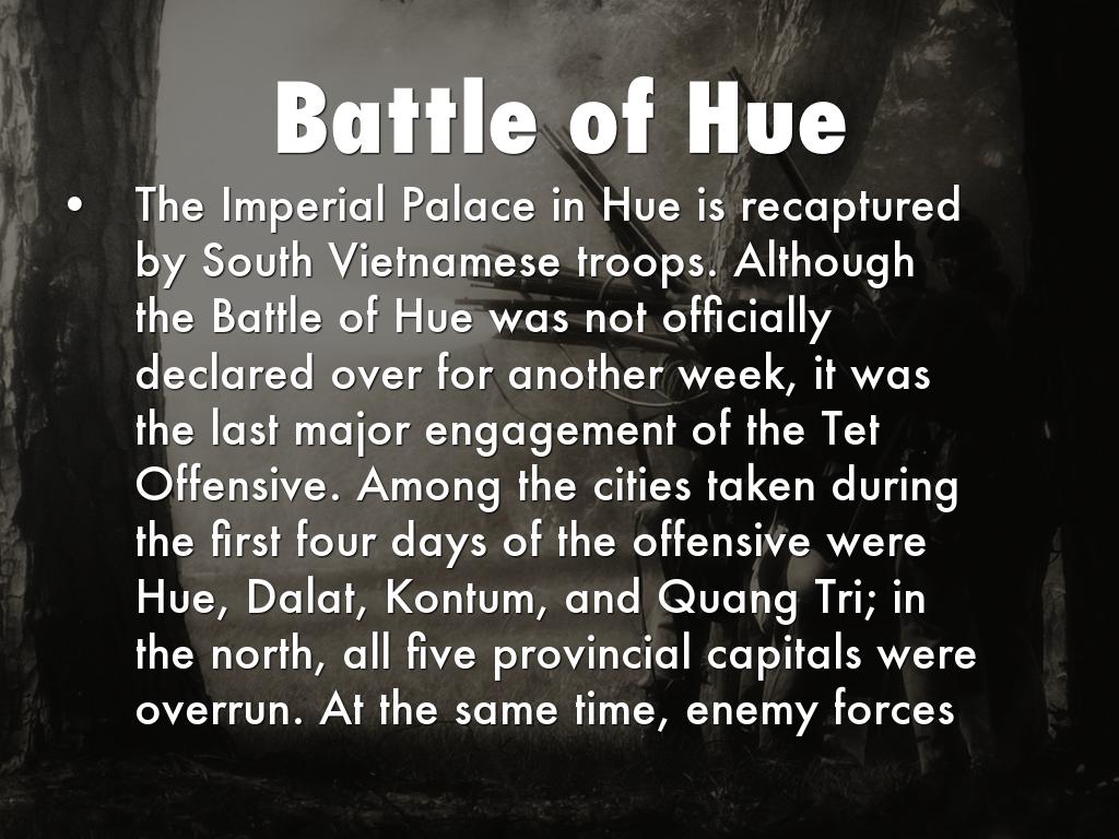 The Imperial Palace in Hue is recaptured by South Vietnamese troops. Although the Battle of Hue was not officially declared over for another week, it was the last major engagement of the Tet Offensive. Among the cities taken during the first four days of the offensive were Hue, Dalat, Kontum, and Quang Tri; in the north, all five provincial capitals were overrun. At the same time, enemy forces shelled numerous allied airfields and bases.