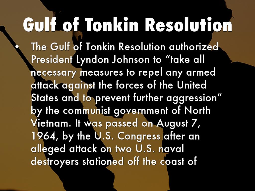 The Gulf of Tonkin Resolution authorized President Lyndon Johnson to “take all necessary measures to repel any armed attack against the forces of the United States and to prevent further aggression” by the communist government of North Vietnam. It was passed on August 7, 1964, by the U.S. Congress after an alleged attack on two U.S. naval destroyers stationed off the coast of Vietnam.