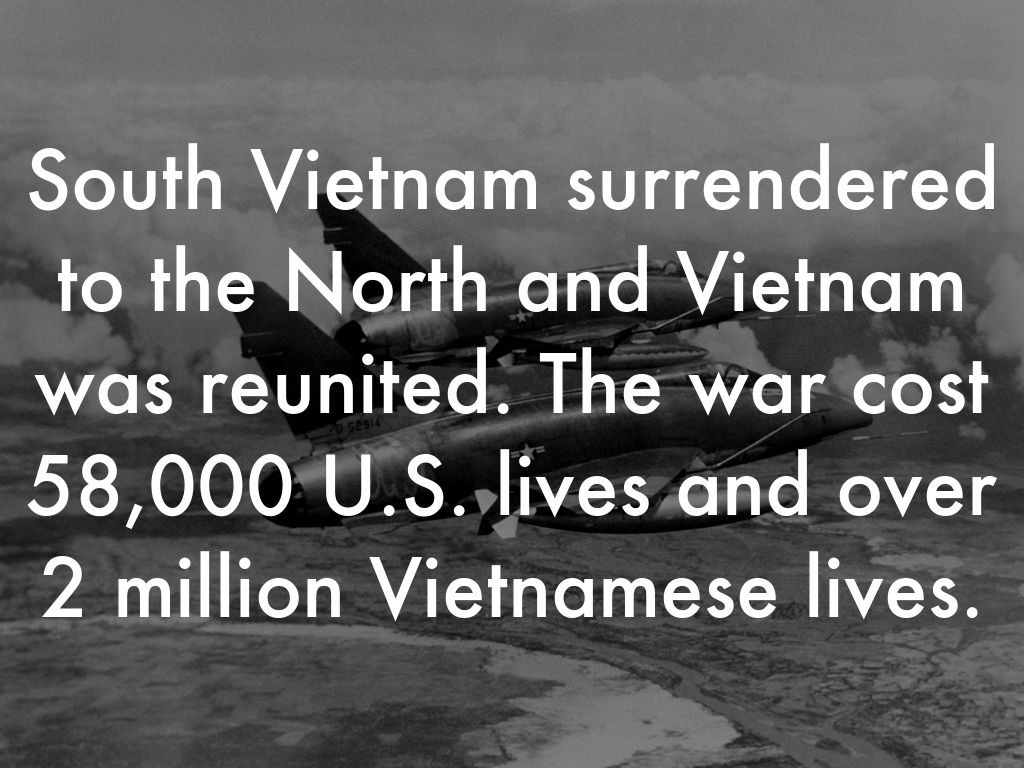South Vietnam surrendered to the North and Vietnam was reunited. The war cost 58,000 U.S. lives and over 2 million Vietnamese lives.