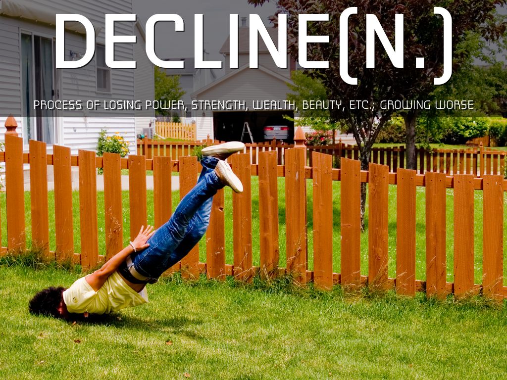 PROCESS OF LOSING POWER, STRENGTH, WEALTH, BEAUTY, ETC.; GROWING WORSE
