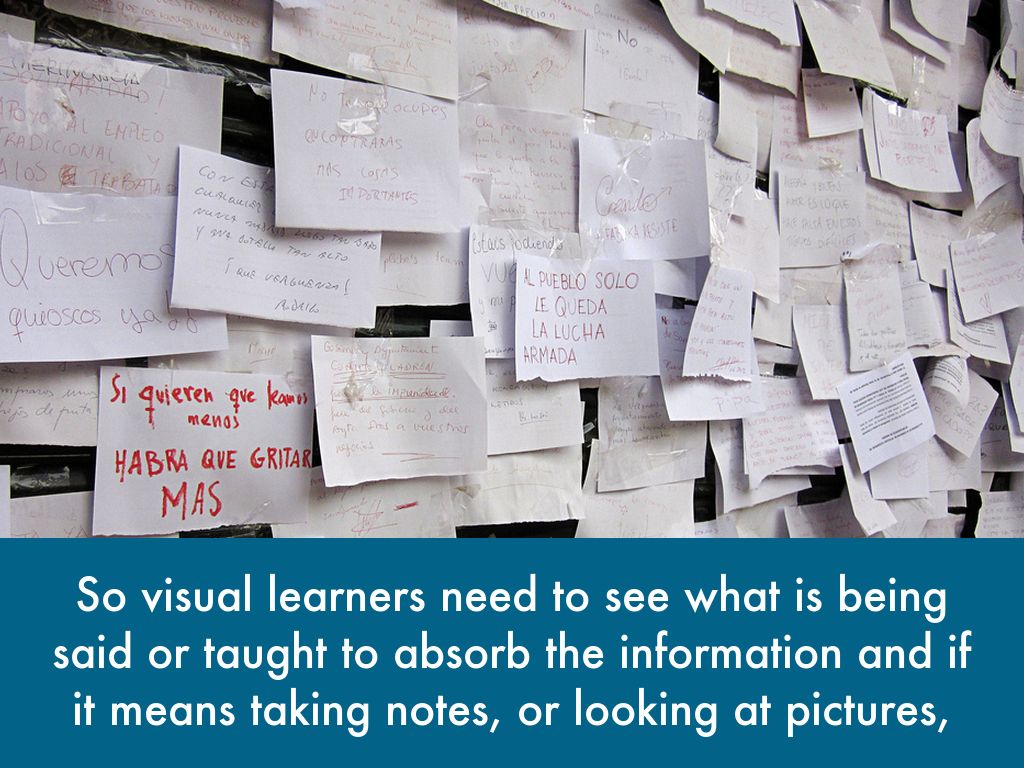 So visual learners need to see what is being said or taught to absorb the information and if it means taking notes, or looking at pictures,
