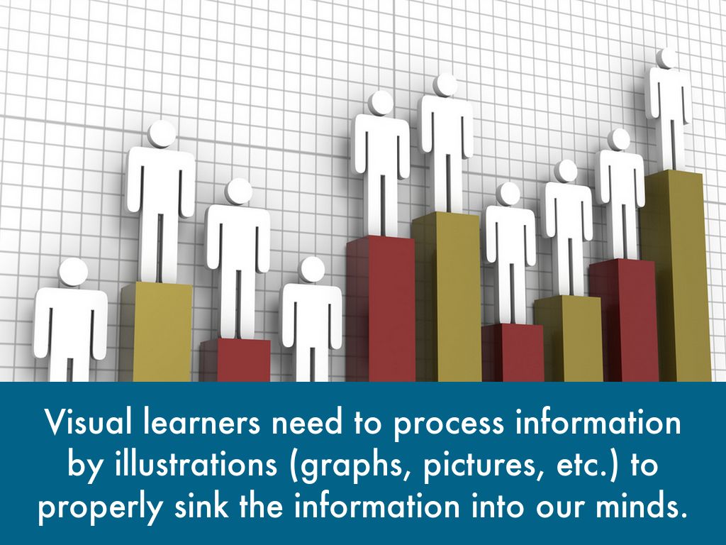 Visual learners need to process information by illustrations (graphs, pictures, etc.) to properly sink the information into our minds.