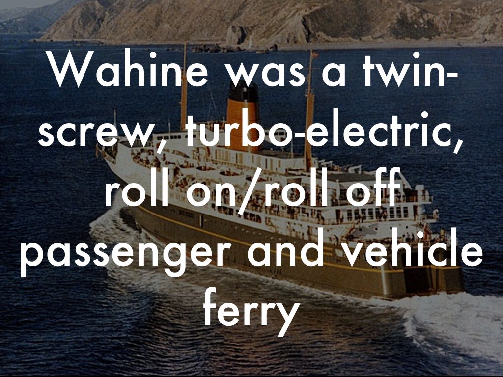 Wahine was a twin-screw, turbo-electric, roll on/roll off passenger and vehicle ferry