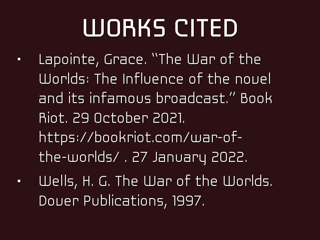 Lapointe, G. (2021, October 29). The War of the Worlds: The Influence of the novel and its infamous broadcast. BOOK RIOT. Retrieved January 27, 2022, from