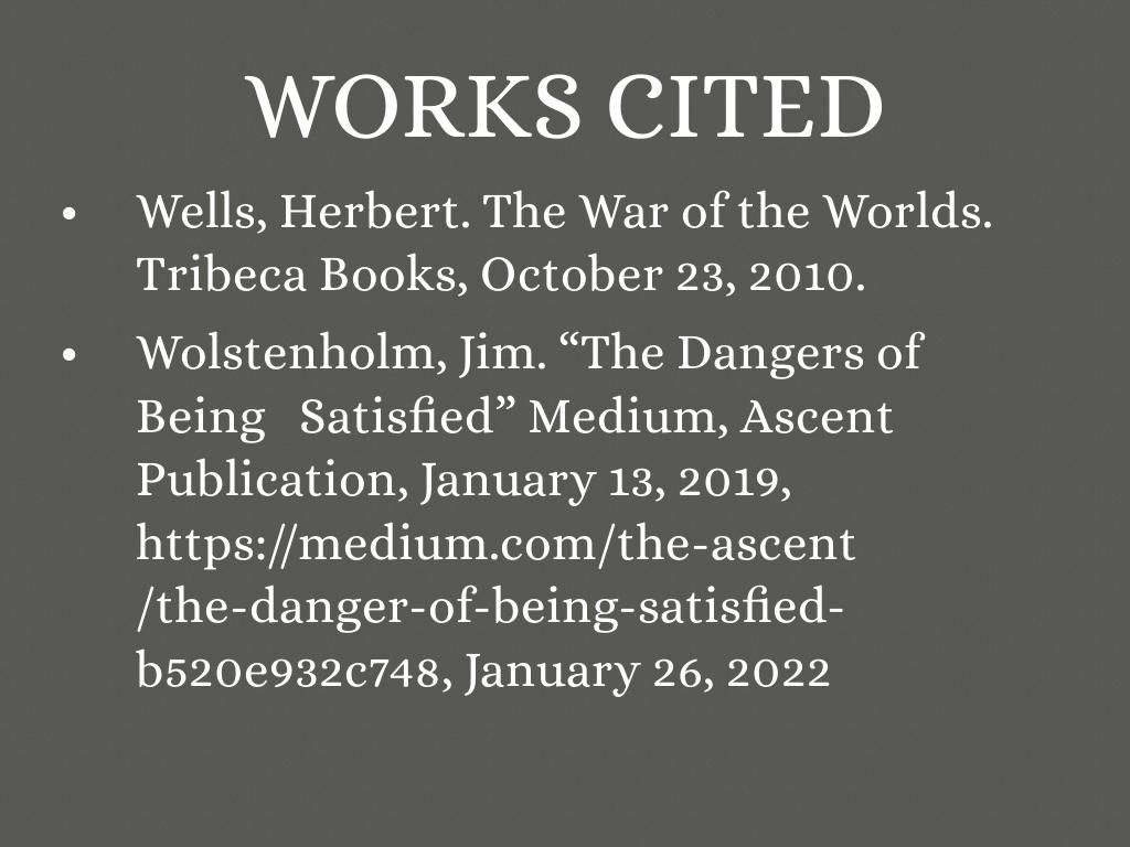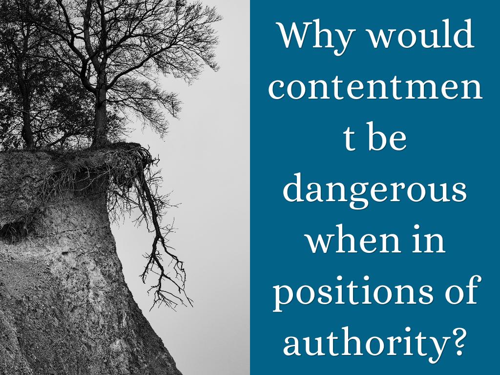 One article called, “The Danger of Being Satisfied”, Jim Wolstenholm explains why being satisfied is like walking on a tightrope (Wolstenholm 4). Wolstenholm explains to readers that upon becoming satisfied, oftentimes complacency and pride arises and can cause people to, “… get left behind” (Wolstenholm 7-10). People tend to make more mistakes when in a state of satisfaction or contentment causing a down fall to places where you may not be content. The only way to maintain where you are is to work to maintain,