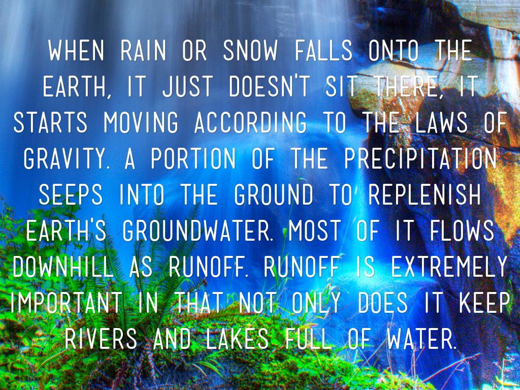 When rain or snow falls onto the earth, it just doesn't sit there, it starts moving according to the laws of gravity. A portion of the precipitation seeps into the ground to replenish Earth's groundwater. Most of it flows downhill as runoff. Runoff is extremely important in that not only does it keep rivers and lakes full of water.