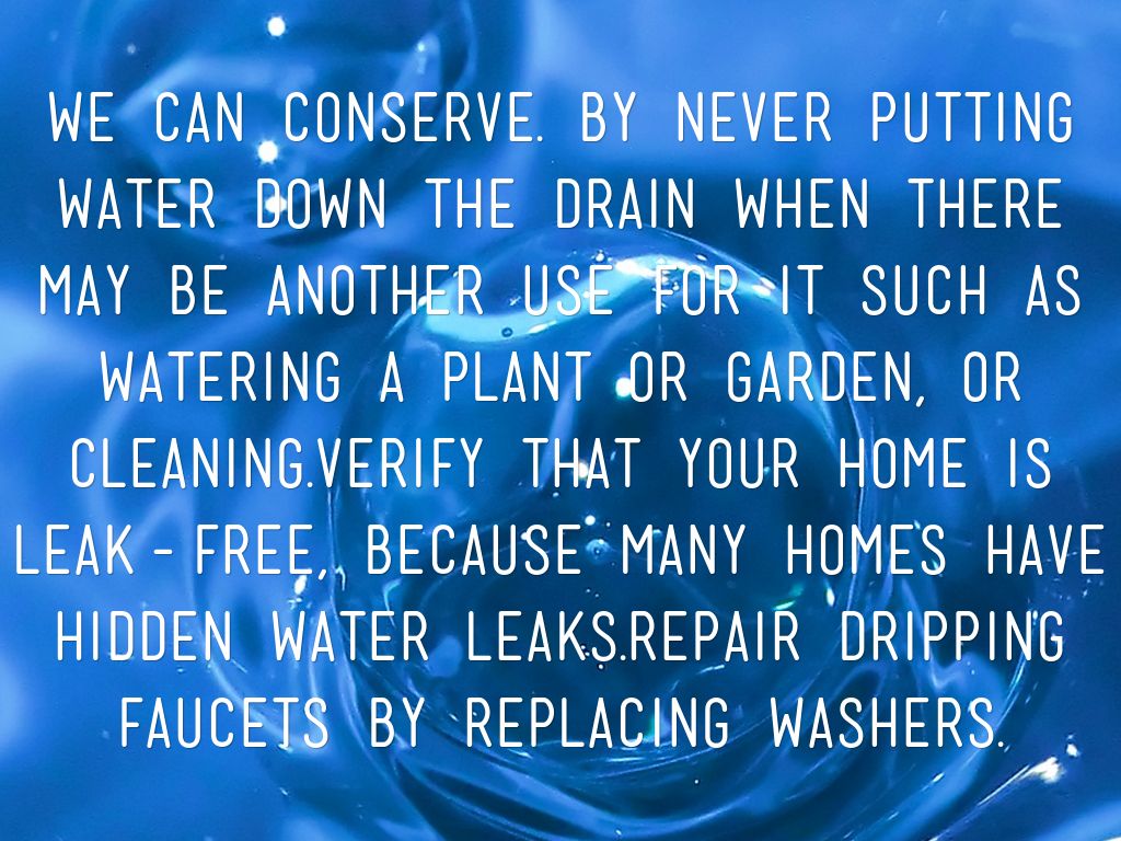 we can conserve. by Never putting water down the drain when there may be another use for it such as watering a plant or garden, or cleaning.Verify that your home is leak-free, because many homes have hidden water leaks.Repair dripping faucets by replacing washers.