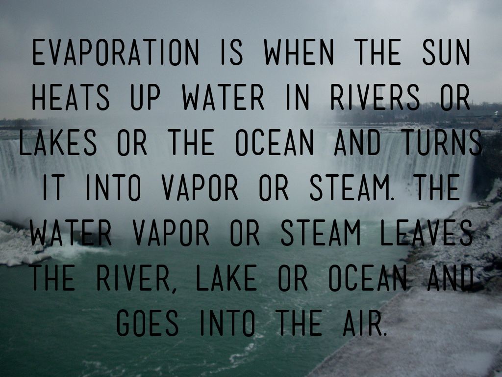 Evaporation is when the sun heats up water in rivers or lakes or the ocean and turns it into vapor or steam. The water vapor or steam leaves the river, lake or ocean and goes into the air.