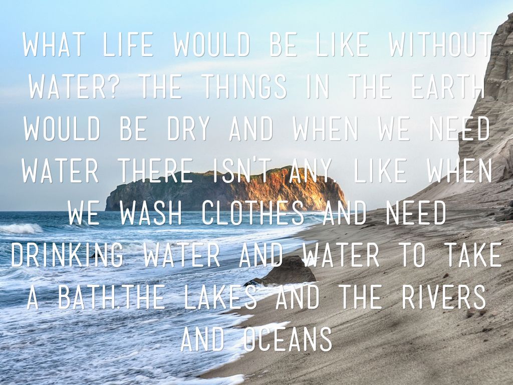 what life would be like without water? the things in the earth would be dry and when we need water there isn't any. like when we wash clothes and need drinking water and water to take a bath.the lakes and the rivers and oceans