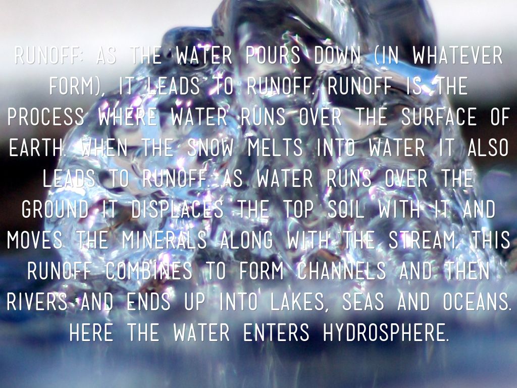 Runoff: As the water pours down (in whatever form), it leads to runoff. Runoff is the process where water runs over the surface of earth. When the snow melts into water it also leads to runoff. As water runs over the ground it displaces the top soil with it and moves the minerals along with the stream. This runoff combines to form channels and then rivers and ends up into lakes, seas and oceans. Here the water enters hydrosphere.