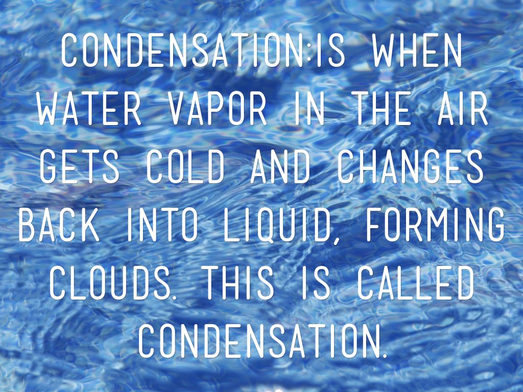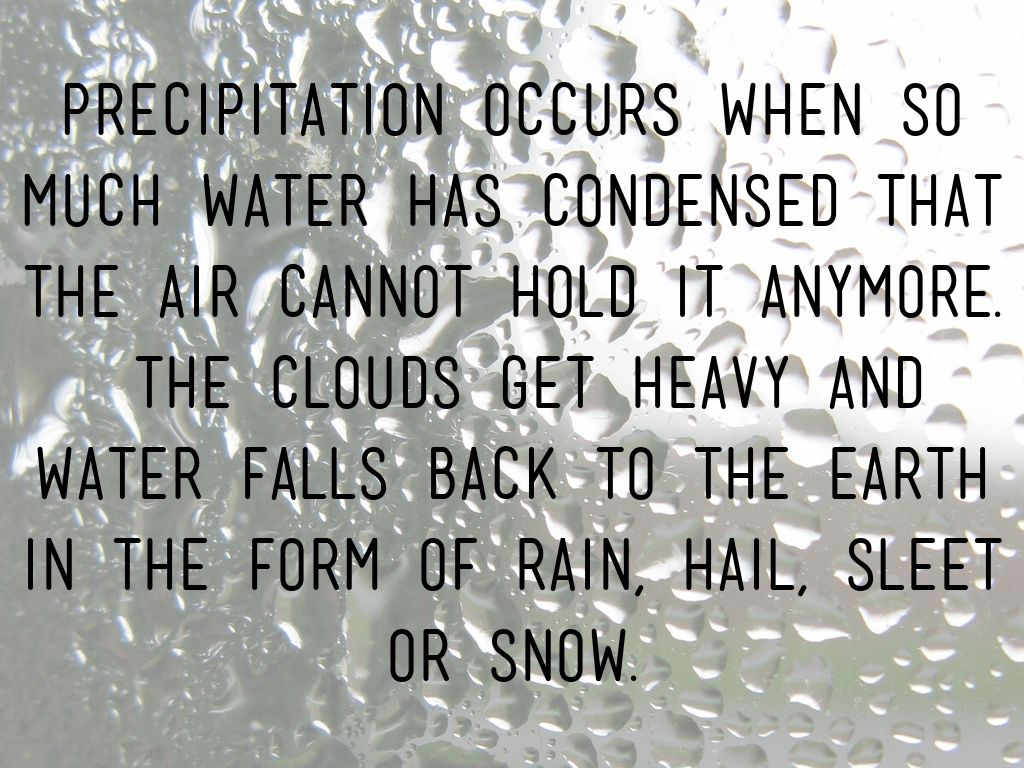 Precipitation occurs when so much water has condensed that the air cannot hold it anymore. The clouds get heavy and water falls back to the earth in the form of rain, hail, sleet or snow.