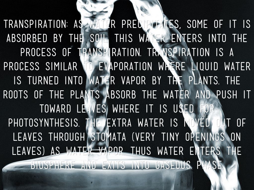 Transpiration: As water precipitates, some of it is absorbed by the soil. This water enters into the process of transpiration. Transpiration is a process similar to evaporation where liquid water is turned into water vapor by the plants. The roots of the plants absorb the water and push it toward leaves where it is used for photosynthesis. The extra water is moved out of leaves through stomata (very tiny openings on leaves) as water vapor. Thus water enters the biosphere and exits into gaseous phase.