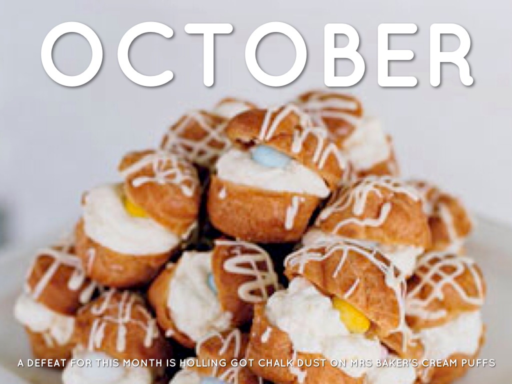 A DEFEAT FOR THIS MONTH IS HOLLING GOT CHALK DUST ON MRS BAKER'S CREAM PUFFS