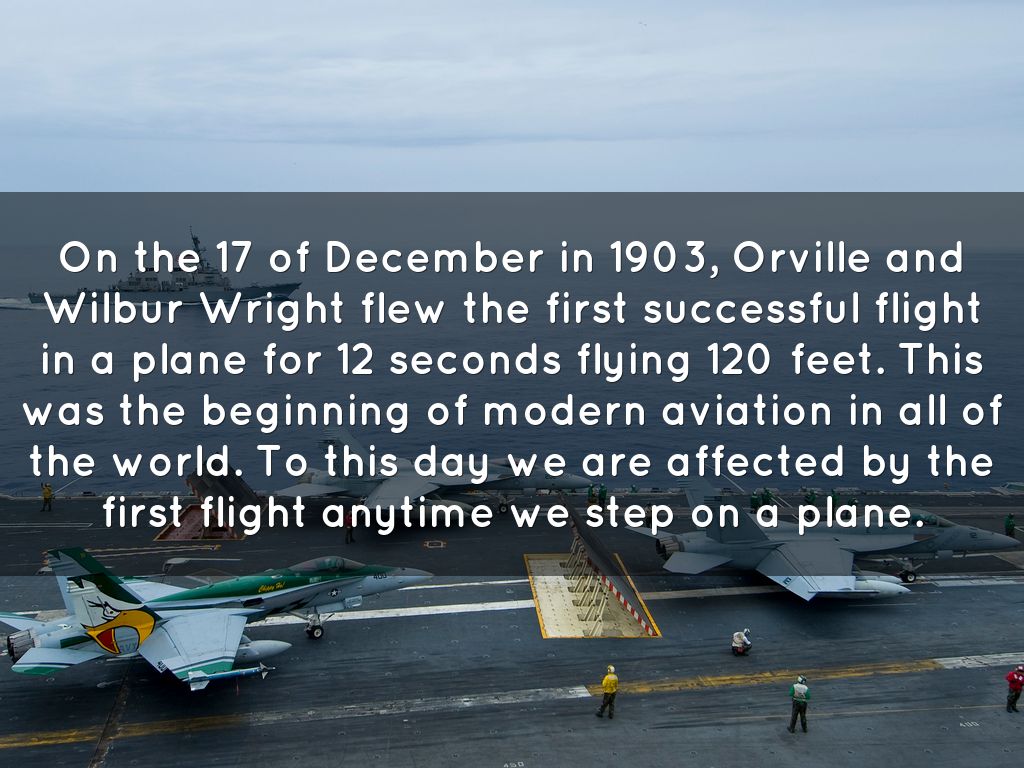 On the 17 of December in 1903, Orville and Wilbur Wright flew the first successful flight in a plane for 12 seconds flying 120 feet. This was the beginning of modern aviation in all of the world. To this day we are affected by the first flight anytime we step on a plane.