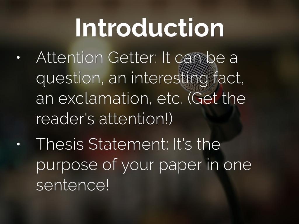Attention Getter: It can be a question, an interesting fact, an exclamation, etc. (Get the reader's attention!)