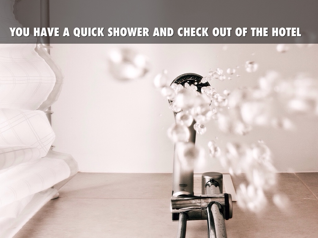 YOU HAVE A QUICK SHOWER AND CHECK OUT OF THE HOTEL