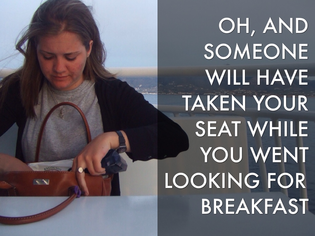 OH, AND SOMEONE WILL HAVE TAKEN YOUR SEAT WHILE YOU WENT LOOKING FOR BREAKFAST