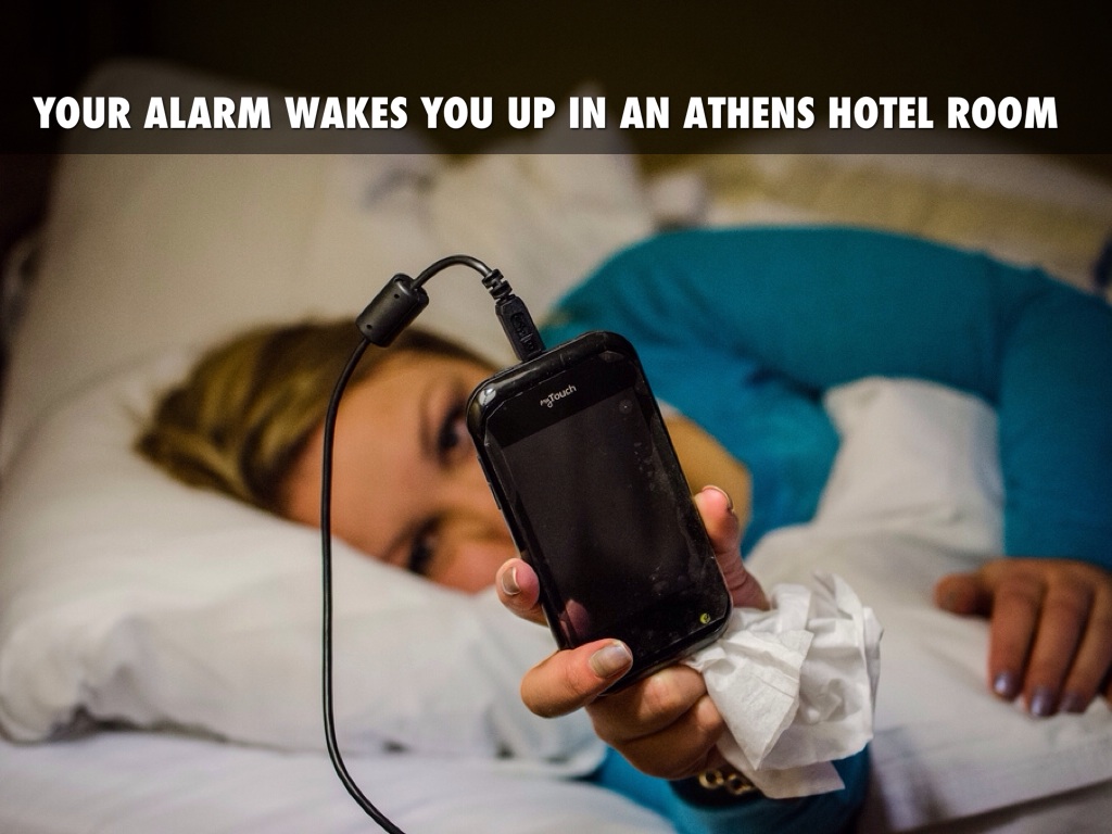 YOUR ALARM WAKES YOU UP IN AN ATHENS HOTEL ROOM