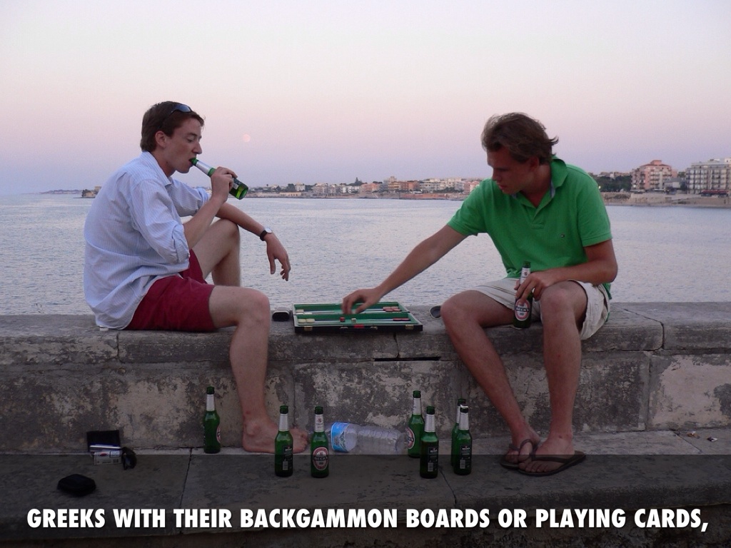 GREEKS WITH THEIR BACKGAMMON BOARDS OR PLAYING CARDS,