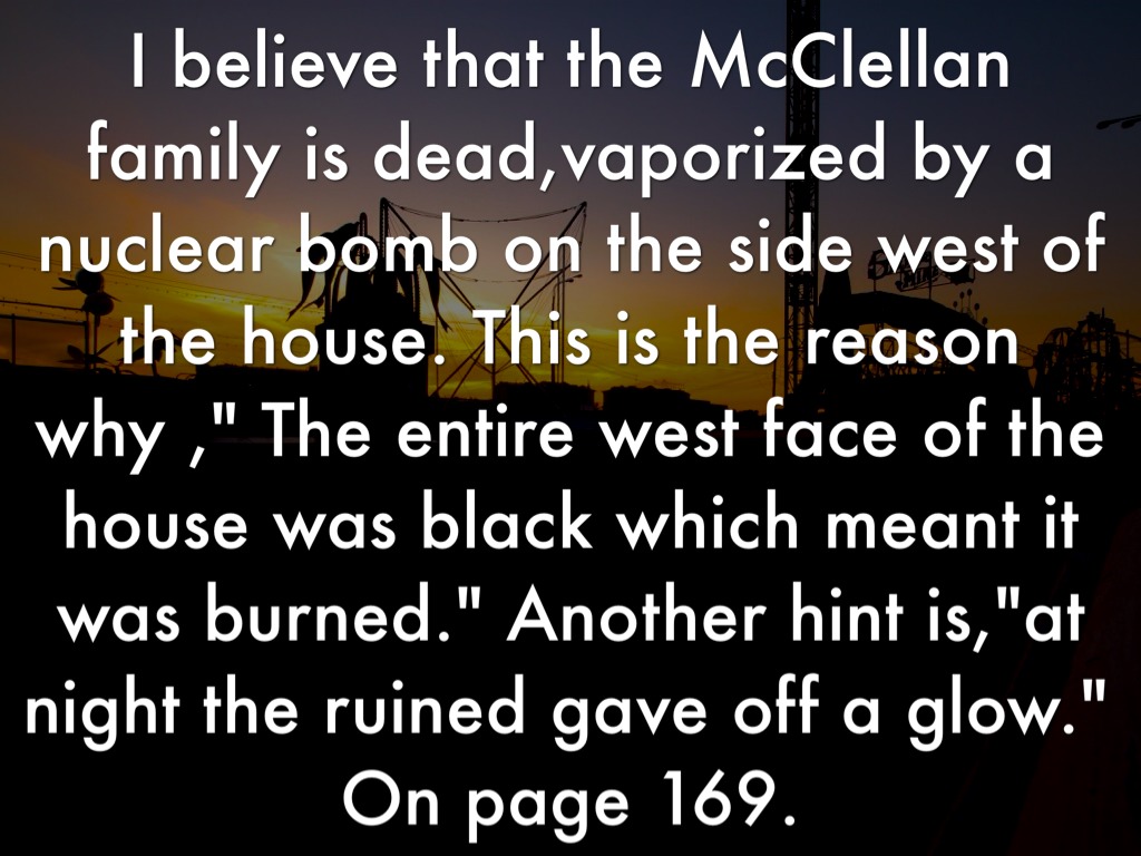 I believe that the McClellan family is dead,vaporized by a nuclear bomb on the side west of the house. This is the reason why ," The entire west face of the house was black which meant it was burned." Another hint is,"at night the ruined gave off a glow." On page 169.