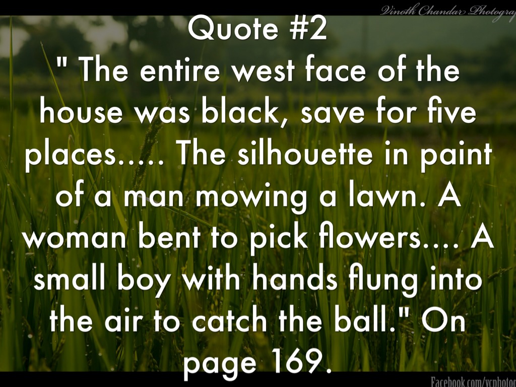 Quote #2 " The entire west face of the house was black, save for five places..... The silhouette in paint of a man mowing a lawn. A woman bent to pick flowers.... A small boy with hands flung into the air to catch the ball." On page 169.
