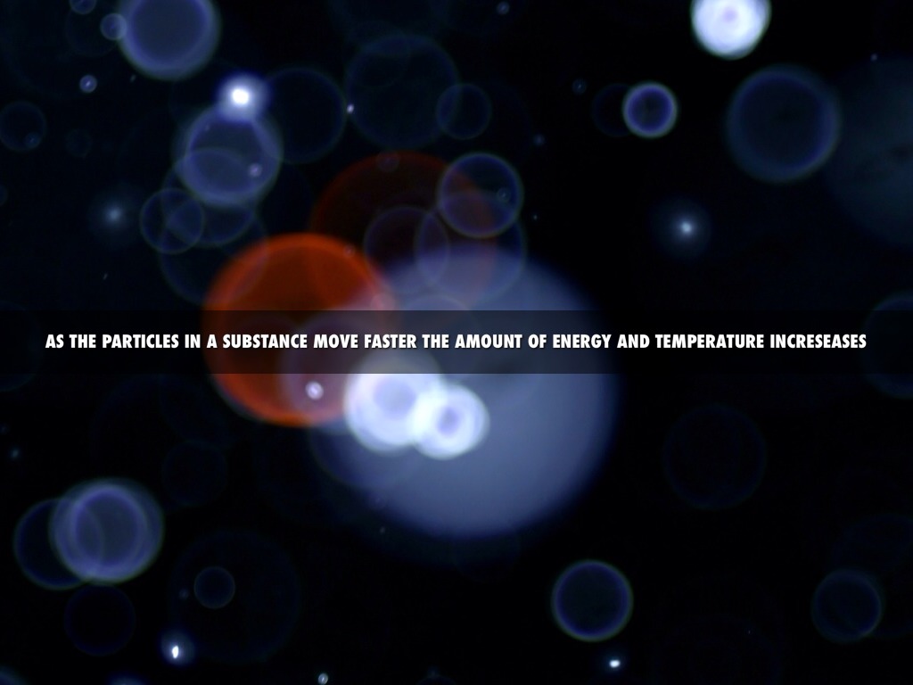 AS THE PARTICLES IN A SUBSTANCE MOVE FASTER THE AMOUNT OF ENERGY AND TEMPERATURE INCRESEASES